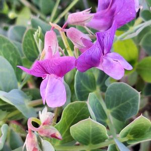 ハマエンドウ(浜豌豆) マメ科レンリソウ属のつる性多年草 別名 キツネマメ・ハマノマメ 海岸の砂地に、ハマエンドウの花が咲いていました。 咲き進むにつれて、花色は、赤紫色から青紫色に変わっていくようです。 花によって、花弁の模様も、それぞれ異なったものもあって、 殺風景な砂地が、少しだけ華やいでいました😆 花も実も、エンドウ豆に似ていますが、 葉は厚みがあって、茎は、かたく、周りの植物につかまりながら這っていました。 若い莢やつる先は、食べられるそうです。 有毒成分を含むそうですが、たくさん食べなければ、問題ないそうです。 少しだけ、茹でて食べてみましたが、味はともかく、 ちょっと、筋っぽかったです😅