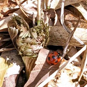 未だもふもふの葉に包まれたままの福寿草の根元を払うと可愛いてんとう虫!🐞 冬眠のお邪魔しちゃったみたい… でも集団でいるらしい他のお仲間は?… 昨年もここのてんとう虫が庭の昆虫の一番乗りでした