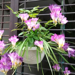 今日は、紫色のフリージアの花が綺麗にたくさん咲いていました。 吊り下げのプランターに、紫色のフリージアの花が綺麗ですね。