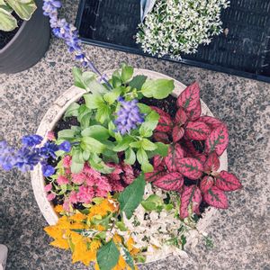 ケイトウとアルテルナンテラエンジェルレースとヒポエステスとたぶんアンゲロニア?の寄植えです。 買ったはいいものの、中々暇とやる気がなくてポットのまま置いてたら、ケイトウが弱ってきたのであわてて作りました😅 写真だと紫っぽいけど実物は結構青に見えるアンゲロニアは、ホームセンターで名無しで売ってたのでアンゲロニアかどうかは不明です。 この花は蝶々がよく密を吸いに来るので眺めるのが楽しいです😊