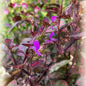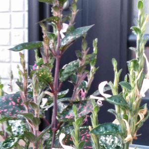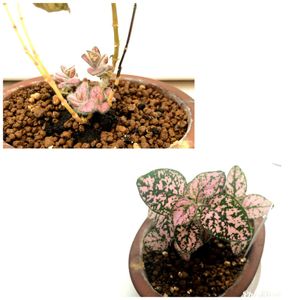ヒポエステス ぐぐっとのびた茎に花が咲きましたが、その葉は緑ぽかった。 でも、根元からキレイなピンクの葉が出てきましたよ❗️ これが丈夫そうなら、長い茎は切ってこちらに更新しようかな🎵