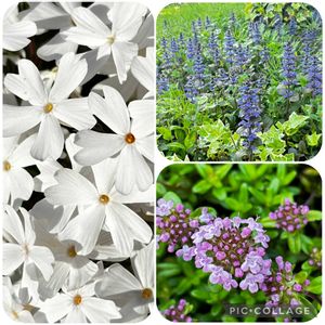 昨日の写真より🌸 庭のシバザクラ アジュガ ロンギカウリスタイム アジュガがスギナに埋もれてるー😂連休中に取らなきゃ!💪 ② こうゆう色も好き❣️シュガーゼリーがやっとここまで育ちました〜 ③ 花の記録 ④ 実家の山で山菜採り あたり一面こごめ(こごみ) ⑤ ヤマワサビの花🌼 食べた事ないけどね