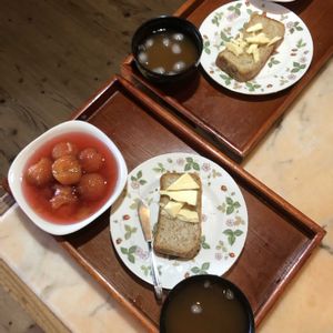お昼ご飯 全粒粉パン エシレバター アサリ味噌汁、インスタント プラムコンポート、シロップ沢山 グランマルニエ