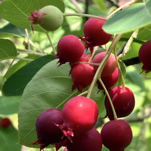 今朝の庭… 7:46 予報より早く雨が降り出した 赤い実はジューンベリー. 甘い❗️ 赤いバラはアンクルウォルター🌹