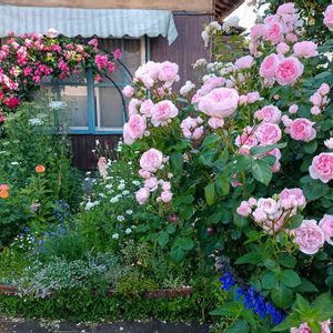 ウチの庭です。 手前はつるバラのシンデレラです。 今年は株元に鉢植えのクレマチス「マダムジュリアコレボン」を置いたのでうまくコラボできました!