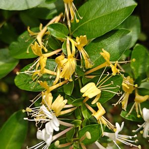 💛( ॑˘ ॑* ) - ̗̀( ˶'ᵕ'˶) ̖́ 💛🤍-- ̗̀( ˶'ᵕ'˶) ̖́- 今日のお花 スイカズラ 💛🤍 (*´ω`*)ノ ( ॑˘ ॑* )💛 (*´ω`*ノ 白花と黄花 蕊もステキです