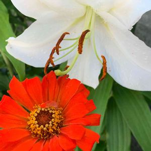 今日の小さな庭 赤いジニア「素敵なカサブランカ🤍さんも 最後の1人になっちゃったね」 カサブランカ「ジニアさんと一緒で 寂しく無いよ❤️」