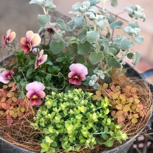 久しぶりの寄せ植え。お気に入りの色合い。wsの先生が塗ったという鉢との相性も◎
