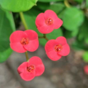 ハナキリン トウダイグサ科トウダイグサ属 多肉植物、熱帯植物、観葉植物、低木 マダガスカル原産 茎が多肉で棘が密生し、サボテンに似ており、花が美しいので観賞用に栽培される。 花期は主に春〜夏だが、一年中咲く。 茎は直立するが、高くなると半つる状になり、這ったり他の物に寄りかかったりする。 葉は長さ3cmほどの楕円形で、若い茎の先に付き、生長すると棘に変わる。 全体の大きさは最大で1mになる。 花は茎の先端に径1〜2cmの杯状花序(トウダイグサ科特有の形)となって、1対の花弁状の苞があって、これが赤、橙、黄、白に着色し目立つ。 🏷️あっ火曜日 に参加させていただきます。