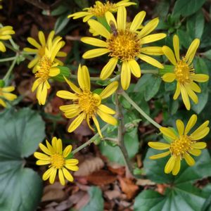 ツワブキ キク科ツワブキ属 多年草 本州の太平洋側では福島県以西、日本海側では石川県以西、四国、九州、南西諸島に分布 主に海岸沿いや海岸近くに自生する。また、花が美しいので観賞用にも植えられる。 名前の由来は艶葉蕗(つやはぶき)つまり、「艶のある葉を持ったフキ」から転じたとする説、厚葉蕗(あつはぶき)つまり、「厚い葉を持ったフキ」から転じたとする説がある。 花期10〜1月 草丈は30〜40cmだが、花茎が晩秋から初冬にかけて70cm位になる。 葉は円形の腎臓型で香りがある。 長さは4〜15cm.幅は6.5〜29cmで、厚手でやや固く、表面は濃緑色で艶がある。 花は花茎の先端が枝分かれした散房花序をつけ、直径5cm前後のキクに似た黄色い頭状花をややまばらに数個まとめて咲かせる。 外周は舌状花で、中心は管状花が集まっている。 ①〜④11/21撮影 ⑤10/21撮影 🏷️日曜ビタミンカラー♪ に参加させていただきます。
