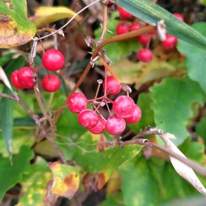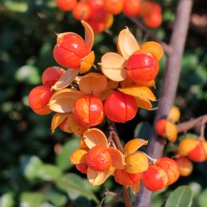 ツルウメモドキ ニシキギ科ツルウメモドキ属 落葉つる性木本 北海道、本州、四国、九州、沖縄まで分布 低地や山地の山野に生え、日当たりの良い林に生育する。 名前はつるになるウメモドキの意味である。 右巻きに他の植物にからみつく。 葉は互生し、長さ5〜10cmの倒卵形から楕円形で、葉柄は2cm前後で、葉縁には浅い鋸歯がつき、波形で丸い形状をしており、名の通りウメやウメモドキに似る。 花期5〜6月 雌雄異株 短い集散花序を伸ばして、黄緑色ないし淡緑色の数mmの小さく地味な5弁花が多数咲く。 果期10〜12月 雌株に付く果実は蒴果で、淡黄色に熟すと、3つに裂開し、鮮やかな橙赤色の仮種皮に覆われた種子が現れる。 🏷️月曜日にビタミンカラー に参加させていただきます。