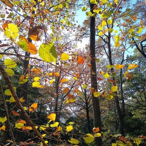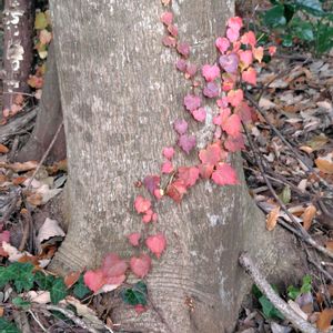 蔦紅葉(つたもみじ) ツタ(ナツヅタ)が秋に赤や橙色に色づく美しい紅葉の様子を表す言葉です。 山野の木々や庭に絡みつく姿や街中の建物の一部を鮮やかに染める様子は独特で趣深いです。 日光がよく当たる場所では鮮やかな赤色に、日陰では橙色や暗紫色を帯びた色合いになるようです。 観賞時期は10〜12月 ①散歩コースの木 ②散歩コースの電柱 ③こんぶくろ池公園の柵 ④野田市郷土博物館の庭のつくばい ⑤野田市郷土博物館の庭の灯籠