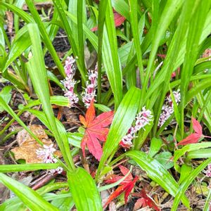 吉祥草(キチジョウソウ) 別名観音草 キジカクシ科 常緑多年草 原産地 日本 中国 陽の当たらない紅葉の木の下で落葉に埋まって咲いてます。🍁🍂🌼 「花が咲くと家が栄える」という中国の言い伝えから命名され縁起の花と知られています。🥰🤗
