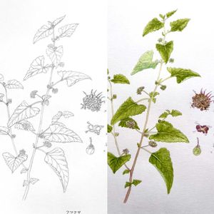クワクサ ① スケッチ画、絵の具彩色 ② 透明水彩画 雄花開花と種散布が変わっている 多肉質部があり 成熟すると膨圧により 雄花も果実も弾き出ると言うけど? まだ確認してません😓