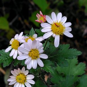 ハナイソギク キク科キク属 多年草 別名はサトイソギク、シモカツギ、ウゴシオギク 栽培のキク(イエギク)とイソギクの交雑種である。 海岸の崖地に見られるが、庭などにも植栽される。 葉は互生し、倒披針形から倒卵形となり、厚みがある。 葉の縁は全縁または上部が浅く羽状に裂けている。 葉の裏面は白色の毛が少し生えて白みを帯びた緑色で、葉の縁は白く縁取られているように見える。 茎の上部に密な散房花序を出し、頭花を多数付ける。 頭花は黄色の筒状花と白または黄色の小さな舌状花からなる。 花期10〜12月 🏷️日曜ビタミンカラー♪ に参加させていただきます。