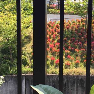 この時期 私のボタニカルスポット ベランダから見える 小学校の土手の赤いツツジ 街路樹のハナミズキ とっても賑やかです(o^^o)