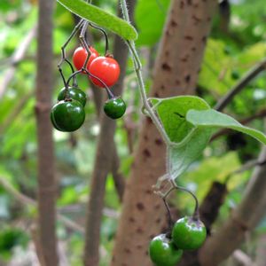 ヒヨドリジョウゴ ナス科ナス属 多年草 日本全土に分布 人里近くの山野の半日陰から日陰になる藪や林縁に生える。 ヒヨドリジョウゴの名は、ヒヨドリがこの実を好んで食べることから付けられたとされるが、実際には特に好んで食べるわけではなく、冬になっても残っていることが多い。 つる性の草本で、他の樹木等にからみつく。 花期8〜9月 花冠は白色で深く5裂し、大きく外に反り返る。 雄しべは5個あり、苞は楕円形をしている。 果期は秋で、1cm程度の球形の液果の実を付け、赤く熟す。