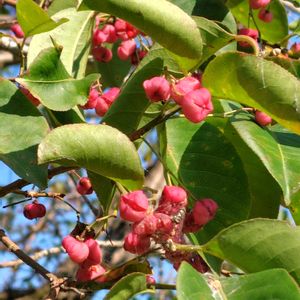 今日のお花 マユミ ニシキギ科ニシキギ属 落葉低木・小高木 北海道、本州、四国、九州に分布 山地や丘陵の林縁に自生する。 名の由来は、樹木が硬くてしなやかであることから、弓の材料として使われたことから。 花期5〜6月 雌雄異株 花は薄い緑色で、直径1cmほどで目立たず、小さな4弁花である。 果期は秋 雌花の後には、葉が青いうちから実ができて、ピンク色から赤く色づく。朱色がかった赤色の四角い果実が熟すと、中から紅オレンジ色の仮種皮に覆われた種が現れる。 昨年と同じ木を観察していますが、今年は果実がまばらで少なくなっています。