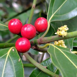 シロダモ クスノキ科シロダモ属 常緑高木 本州山形県宮城県以西、四国、九州、南西諸島に分布 山地や低地の比較的湿潤な森林に生育する。 庭木や防風林としても植栽される。 シロダモの名は、葉の裏が白いタモ(クスノキ科の樹林)の意味とされる。 葉は互生し、長楕円形〜卵状長楕円形で、8〜18✕4〜8cm。先端は尖り、全縁で葉脈が目立つ。表面は無毛で光沢があり、裏面は絹毛が多く粉白である。 花期は9〜11月 雌雄異株 花は小さく淡黄色で、散形花序である。 果期は10〜11月 お花と同時に赤い実を観賞できる。果実は液果で楕円形球状で長さ12〜15mmである。この果実は昨年の秋の花の実である。