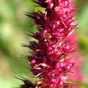 ムラサキアオゲイトウ ヒユ科ヒユ属 一年草 熱帯アメリカ原産 ホソアオゲイトウに花穂が濁った紅紫色になるものがあり、ムラサキアオゲイトウと呼ばれる。 日本には明治時代に渡来した帰化植物 北海道〜沖縄まで分布 道端や畑地、荒れ地などに見られる。 花期7〜11月 茎は直立し、高さ0.6〜2mである。 葉は菱状卵形で、長さ5〜12cm、葉柄は2〜7cmである。 花穂は緑色、円柱状で、幅5〜7mm。 花穂はほっそりし、全体は円錐状になる。雄しべが5個、花弁も5個ある。 お花がなくなる時期なのに、とてもよく目立っていました。