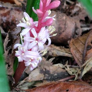 キチジョウソウ キジカクシ科キチジョウソウ属 常緑多年草 本州関東以西〜九州に分布 在来種 家に植えておいて、花が咲くと縁起が良いと言われるので、吉祥草の名がある。 花期8〜11月 高さは10〜30cm 地下茎が長く伸びて広がり、細長い葉が根元から出る。 根元から総状花序を出し、下部は両性花、上部は雌しべのない雄花が混じり茎は紫色である。 花は白い花被が基部で合生し、筒状となり、先は6裂して反り返り、6本の雄しべが突き出る。