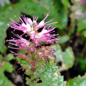 ミカエリソウ シソ科テンニンソウ属 落葉小高木 本州福島県以西、四国、九州に分布 山地の林床に自生する。 別名はイトカケソウ 草のように見えるが、茎が木化する。シソ科では珍しい木本植物である。 葉裏には細かい星状毛が密生している。 茎の先端に総状花序を付け、淡紅色の花を密に付ける。 長く突き出る雄しべと雌しべが特徴である。 花期9〜10月