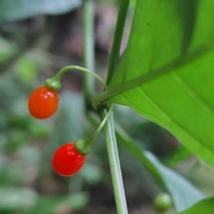 ハダカホオズキ ナス科ハダカホオズキ属 多年草 本州、四国、九州、琉球列島に分布 山地の林縁に生える。 花期8〜9月 草丈は60〜80cm 葉は6〜23cmの卵形〜長楕円形で、先は尖り、基部は狭まって柄に続く。 花は葉腋から2〜4個ぶら下がるように下向きに付ける。淡黄色で5裂した小さな花で、径8mmで裂片は短く反曲する。 果実は球形で8〜10mmで赤く熟す。萼は花期後も大きくなることはなく、果実を包まない。 このことから、ホオズキのように萼が果実より著しく大きくなり、果実を包むことがないことから、裸のホオズキと呼ばれる。 ①② 10/24 高尾山にて撮影 ③〜⑤ 11/4 三ツ堀里山自然園にて撮影 来年はお花をぜひ見てみたいです。 🏷️あっ火曜日 に参加させていただきます。