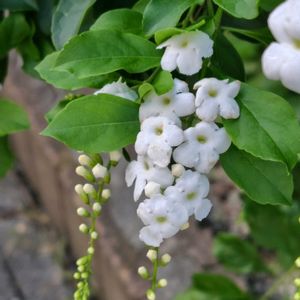 デュランタ クマツヅラ科ハリマツリ属(デュランタ属) 熱帯植物(低木) アメリカ・フロリダ地方〜ブラジル原産 和名はハリマツリ、タイワンレンギョウ 花期6〜10月 樹高は1.8〜4.5m 葉は対生で楕円形、葉縁は全縁か円鋸歯状で無毛である。 花は総状花序が頂生し、花冠筒は長さ7〜10mm、裂片は長さ2〜6mmである。 果実は黄色あるいは橙色の核果に円錐状のくちばしが付いたもので、直径5〜7mmである。 藤紫色や白の小花が集まって、房状に垂れ下がって咲く人気の熱帯花木である。丈夫で開花期間が長く、霜に当てなければ、戸外でも冬越しするので、暖地では庭木としても植えることができる。 🏷️白い水曜日♡ に参加させていただきます。