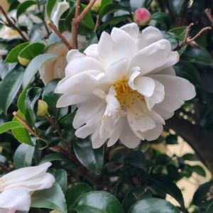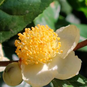 チャノキ ツバキ科ツバキ属 常緑小高木または常緑低木 原産地はインド、ベトナム、中国西南部とされるが、詳細は不明。 日本では伊豆半島や九州地方に自生する。 花期10〜12月 葉は互生する。長さは5〜7cmの長楕円状披針形で、先端は鈍いがわずかに尖り、縁には鋸歯がある。表面は濃い濃緑色で、やや艶がある。 花は白色の5弁花で、花芽は夏頃に見られ、丸くて柄があり、ほぼ下向きに付く。 花は新枝に付き、短い柄でぶら下がるように下に向く。 花冠は白く径2〜3cm、多数の雄しべが付き、ツバキの花に似るが、花弁が抱え込むように丸っこく開く。