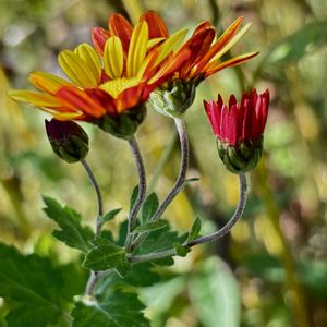 キクの花 表は黄色で裏が赤っぽいえんじ色? お行儀が悪く縛ってます。🙏☺️ でもたくさん咲いてくれます。🥰 菊の花の名前は分かりにくいですね。😌