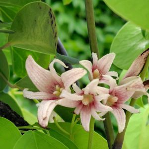 今日のお花 ムベ アケビ科ムベ属 常緑つる性木本植物 別名はトキワアケビ、ウベなど。 本州関東地方南部以西、四国、九州、沖縄に分布する。 暖地の山地や山野、海岸近くに自生する。また、日よけ棚などに庭に植えられることもある。 葉は柄がある掌状複葉で、小葉はふつう5枚付く。小葉は厚い革質で、深緑で艶がある。表側はやや色が薄く、網状の葉脈が見える。 花期4〜5月 雌雄同株で、雌花雄花がある。 花は総状に付き、雌花は雄花より大きく、芳香がある。 花色は外側は淡黄緑色を帯び、内側は暗紅紫色で、雌花雄花ともに花弁はなく、6枚の萼片からなる。 果期9〜10月 果実は5〜7cmの楕円形で、暗紅紫色に熟す。熟してもアケビのようなには割れないのが特徴である。 11月15日は七五三ですね。 ムベの葉は、幼木の頃は3枚、生長するにしたがって5枚、7枚と増えていくので、七五三の縁起木と言われている。 また、その果実は不老長寿の果物とされ、毎年秋になると、ムベの果実が皇室に献上されるという縁起の良い果物とされている。 4/22 お出かけ先にて撮影