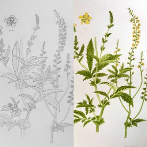 キンミズシキ ① スケッチ画と透明水彩彩色 ② 透明水彩画 果実はトゲがあり、ひっつき虫 繁殖力旺盛