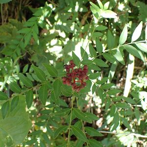 フユザンショウ 実が赤くなっていました。サンショウに似ています。(①) 葉は、奇数羽状複葉。小葉はI〜3対です。葉を揉むと、サンショウの香りがしました。 葉軸に翼があります。(②) 葉の裏は、白みを帯びていました。(③) 枝の刺は、対生でした。(④) 樹皮は、刺とコブがありました。(⑤) この木は雌株です。 フユザンショウは、雌雄異株だそうですが、雄株が少ないそうです。 どうやって花が咲き、実がなるか、よくわかっていないそうです。 不思議な樹なんだなあと思いました。でも、いい香り! 10.17