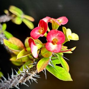 ハナキリン トウダイグサ科 多肉植物 原産地 マダガスカル 棘がありますが、優しいトゲなので触れても痛くないですね。 花に見えるのは苞で実際の花は中心にあります。🌸 一年を通して咲いてます。 冬は室内です。🌸🌸🤷♀️ 大きくしないで✂️しながら育ててます。