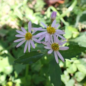 ノコンギク この日歩いた道には、シラヤマギク、ユウガギク、シロヨメナが多く、そのほかの野菊には、会えないかと思っていたら、 これは? 山の中の、明るい原っぱのような場所に咲いていました。 ノコンギクではないでしょうか。 花の大きさは、2.5センチくらい。 枝の先に集まって咲いていました。 薄紫色でした。(①) 横から見ると、総包片がそりかえっていて、ワイン🍷グラス型でした。(②) 茎には細かな毛が生えていました。(③) 葉の表面にたくさんの毛が生えていて、ザラザラしていました。脈があり、縁のギザギザは、深くも浅くもない感じ。(④) 葉の裏にも、毛が生えていました。 (⑤) これで、花びらが取れたあと、実の毛(冠毛)の長さが長いと、はっきり、ノコンギクとわかるのでしょうが、まだ、花びらは、取れていませんでした。 また、見にこなくっちゃ💦 この季節にしか、出会えない野菊。 たくさん見て観察したい。 そして、覚えたいな。 ちなみに、高尾山で、カントウヨメナとはっきりわかる野菊にまだ出会えて、いません。 やっぱり、野菊は難しいです。 10.17