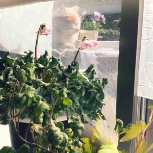 部屋の中から外の多肉棚の上で寝ているこまちゃんを撮りました🐱♪̊̈♪̆̈ シクラメンは、日光不足で弱った鉢植えが気になってお店から救出したものです 化石リボンという変わった名前です 葉の色が濃くなって、小さい蕾も上がってきました(*^^*) キレイに咲きますように(人´∀`*)🌸