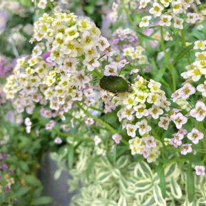 •アリッサム ワンダリングミックス #アオヒメハナムグリ 一昨日エレベーターホールに🐝オオスズメバチが出没し始めました🐝のポスターが張り出されていた。今年もその季節が始まった模様。 割とシャレになんないのに冷やし中華始めました、みたいなノリがこなれ感あってオシャレだよね。 それからというものの写真撮るにも水やりするにも緊張が走るエブリデイ。 顔のすぐ横でブーン!と音がしたから失禁しそうになったけど、音の主はただの天使だった。