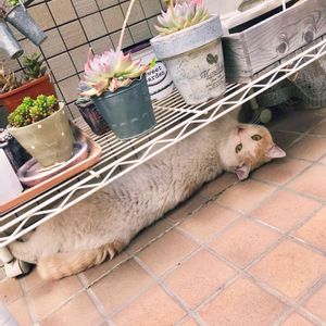 通い🐱こまちゃんは、最近はここが お気に入り🎶 ちょっと冷っこくて気持ちいいニャ〜😽 こまちゃん、長~い(笑)