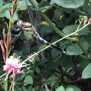 シオカラトンボでしょうか? 突然虫が現れると気持ちが焦るのか ピントが合わなかったり構図がイマイチだったり 何枚撮っても 納得の1枚がありません