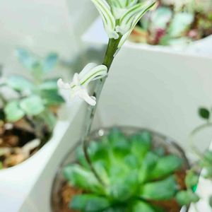 ハオルチア マリン錦 ちょろっと斑入りのニョキニョキ徒長したマリンを買ってから1年くらい経ちました! 現在は、新しい葉っぱに斑は無し😂 ですが葉っぱが短く仕上がって、横から見るとぺったんこが可愛い😍 真ん中に花芽🌸 徒長した葉っぱは、外側に一周あるのみになりました✨ 半分白い斑入りの子株がとれたので大切に育てています♪