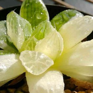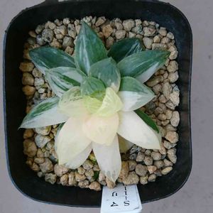 ハオルチア オブツーサ交配錦。確か、マリン×ドドソン紫オブツーサだったはず・・・。 親株が提灯になって、胴切りして出た個体。胴切りから2年くらい経ったかな? マリン譲りの真っ白な斑がとても綺麗。