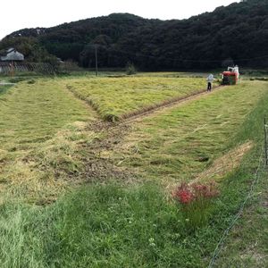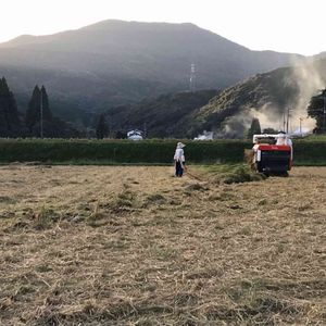 台風の影響で倒れた稲もようやく刈り取りできました 後ろの山の方では野焼きやっております 火事ではござらん わたくしも田んぼの畦道はよく野焼きで ケムリだらけでおます! もう少しで新米が食べれますわ