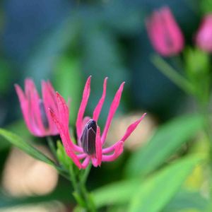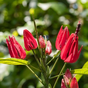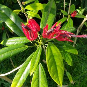 咲くやこの花館 2/8 「パボニア・グレドヒリイ」 ✳︎花弁に見えるのは真っ赤な苞(副萼片)だそうです。その中に濃紫色の萼に包まれて花がつく