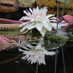 パラグアイオニバスの花 草津市立水生植物公園みずの森にて。 夜間開演イベントに参加してきました。 ガイドツアーの説明で受粉の仕組みを知りました。 パラグアイオニバスは2晩だけ花を咲かせます。 1晩目、白色の美しい花を咲かせ、良い香りを出してコガネムシの仲間を呼びます。午前中には花が閉じ、翌日まで一晩閉じ込められ、その間に花粉が付きます。 2晩目、夕方に再び花が開くと、この株の花粉をつけて次の株へと運びます。花はピンク色に変わります 画像の花は2番目のものです。 とても面白い(^_^)。