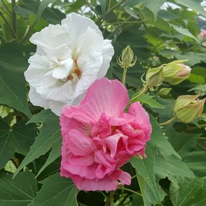 スイフヨウ(酔芙蓉) 真夏は朝からピンクだったように思うけれど、今日のような気温が低い曇りの日などは、昼になっても白い花が残っている。 深酒をしなくなったのかな(*^^*)