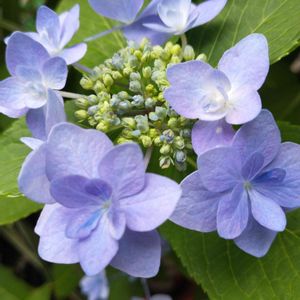 また、登場で〜 💙ブルーのオタフク紫陽花(ウズ紫陽花)変化に魅了されてます 江戸時代に作られた、額アジサイの園芸品種だとか 紫色に変化した💜装飾花の中 💙青い花(両性花)が弾け~シべも可愛いでしょ💕