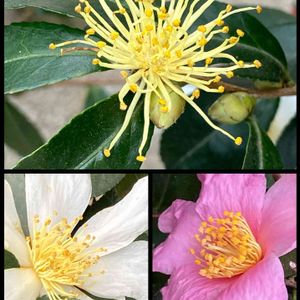 おはようございます🎵 公園に咲いていた山茶花♡ですが…🌸🌿🍁 ↙️↘️は、白とピンクですが、⬆️は、白の花びらが全て散ってしまって、シベだけ残っていました❗️ そして、下の地面には、白い花びらが散り落ちてました…😢💧 シベだけでも咲いている姿に応援したくなりました⤴️🌸🌿