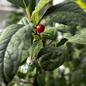 どんより曇り空の下のウメモドキの実。 沢山実がついていたのに残ったのはこの一粒。貴重な一粒残ってよかった!植えつけて一年たってないので上等です。
