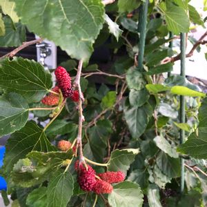桑の実が大きく、たくさん実ってきました。先般、6年ぶりくらいに少し大きめのプランターに植え替えたので、元気になったのかなぁ