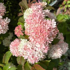 🌲樹に咲く花🌲 ①②アメリカテマリシモツケ バラ科 落葉低木 葉色が銅葉(ブラウンレッド) 花は手毬状の花です🎶 ③④⑤桜卯木(さくらうつぎ) アジサイ(ユキノシタ)科 花は5弁の桃色て〰︎ 花の周辺のみが淡い紅花に染まり 外側は細い白い線で縁取られている